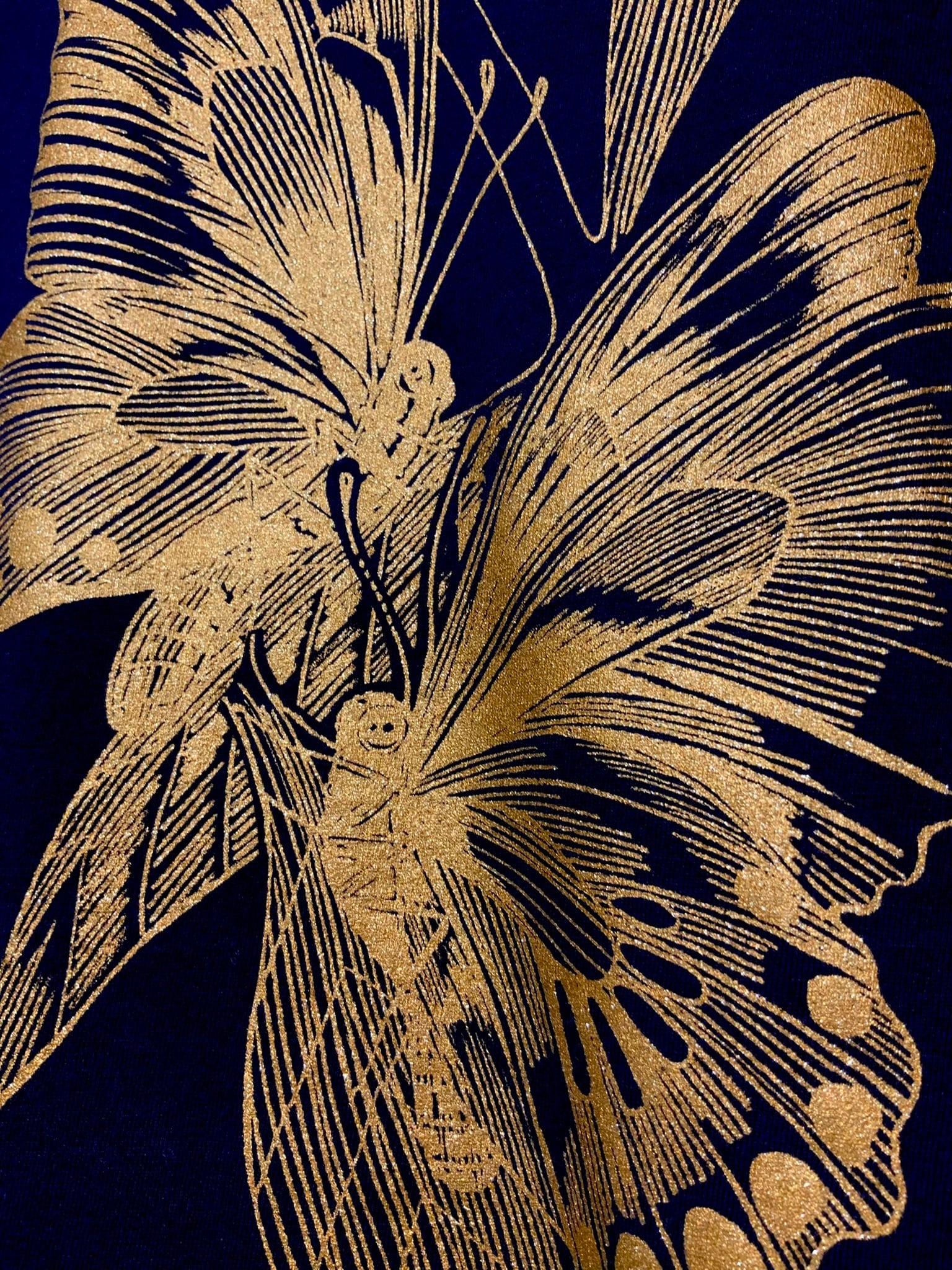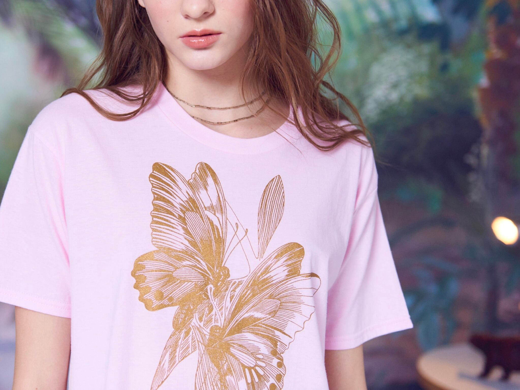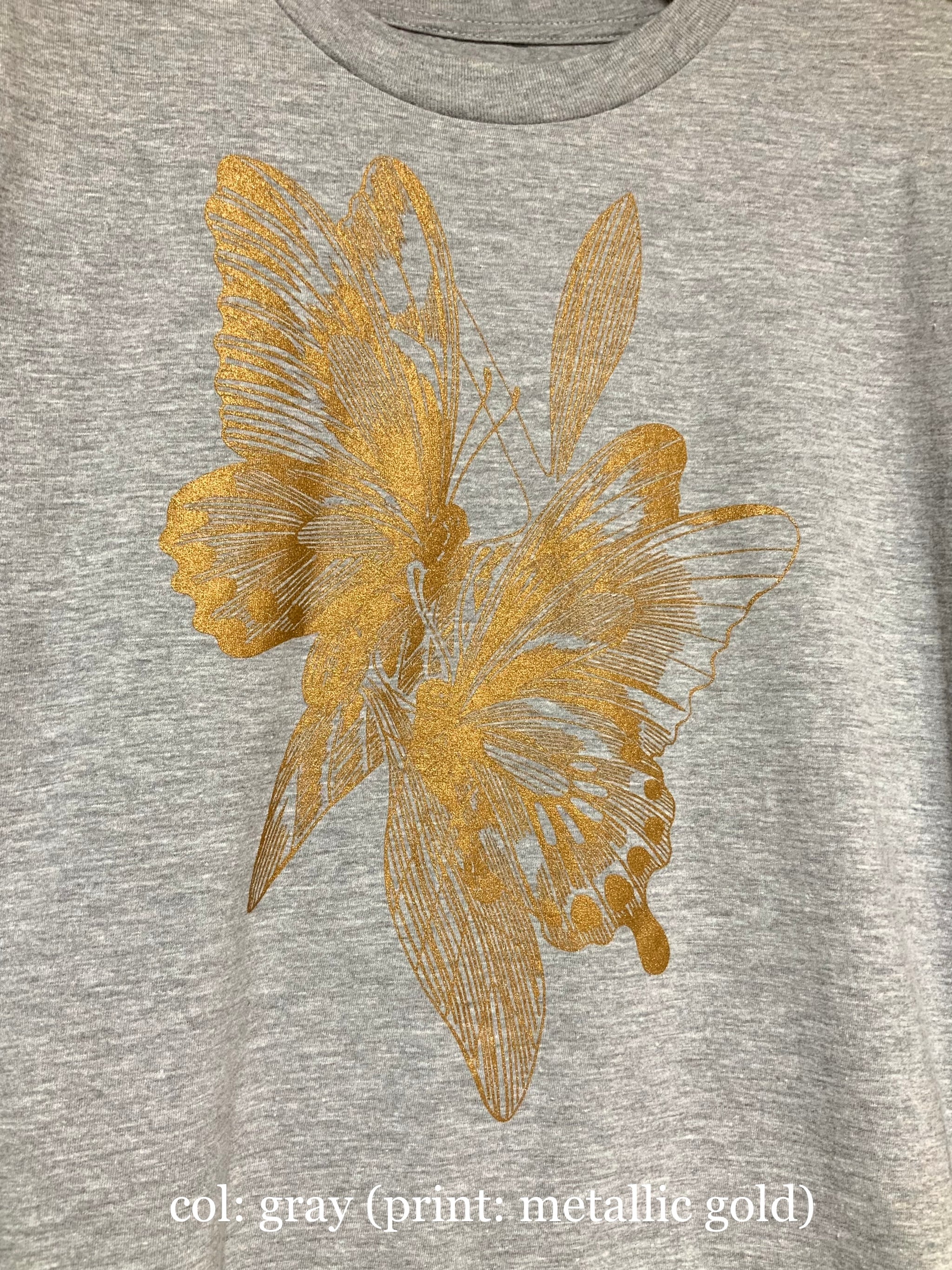 メタリックゴールドラインで描かれた蝶柄のTシャツです。