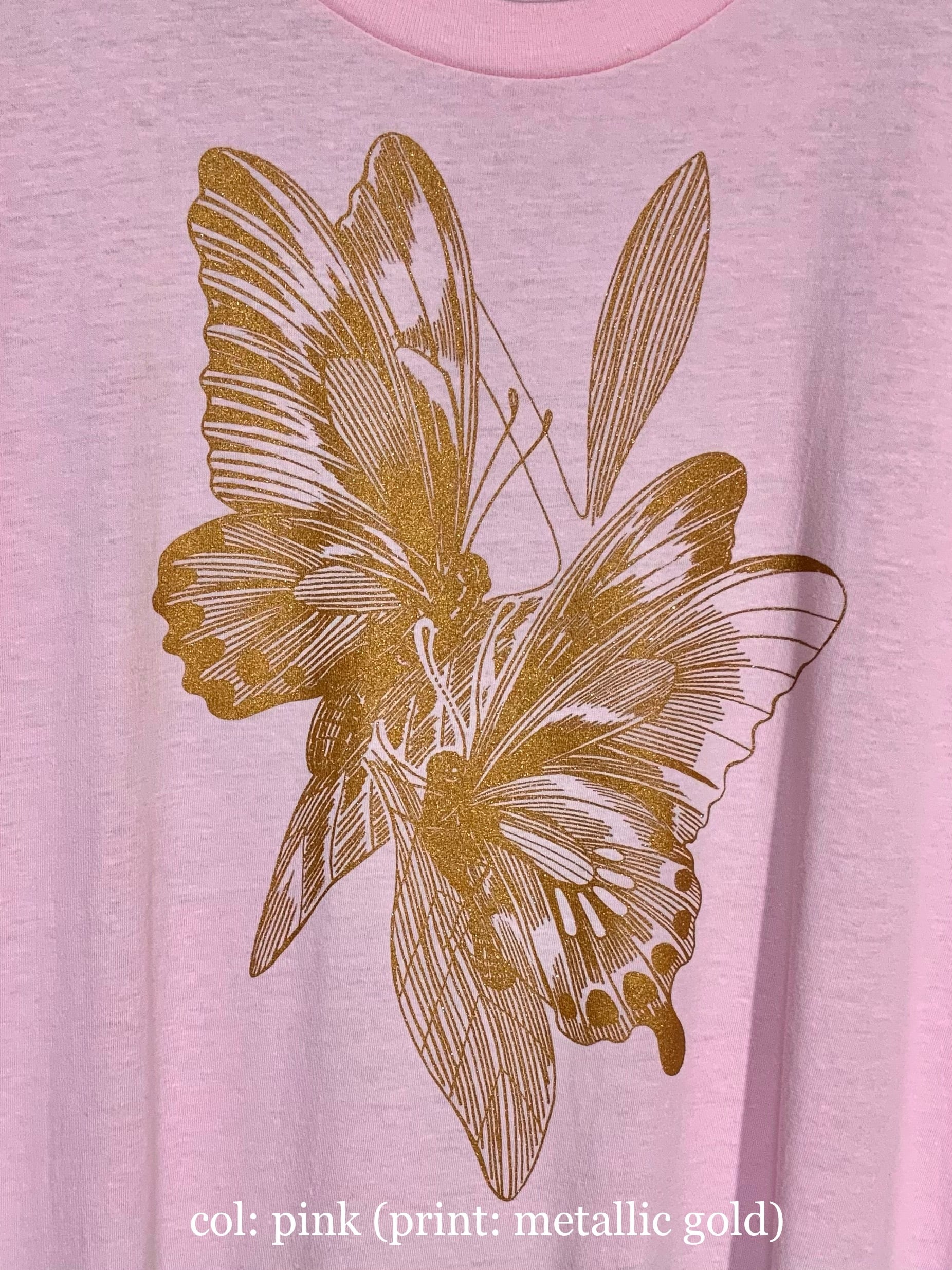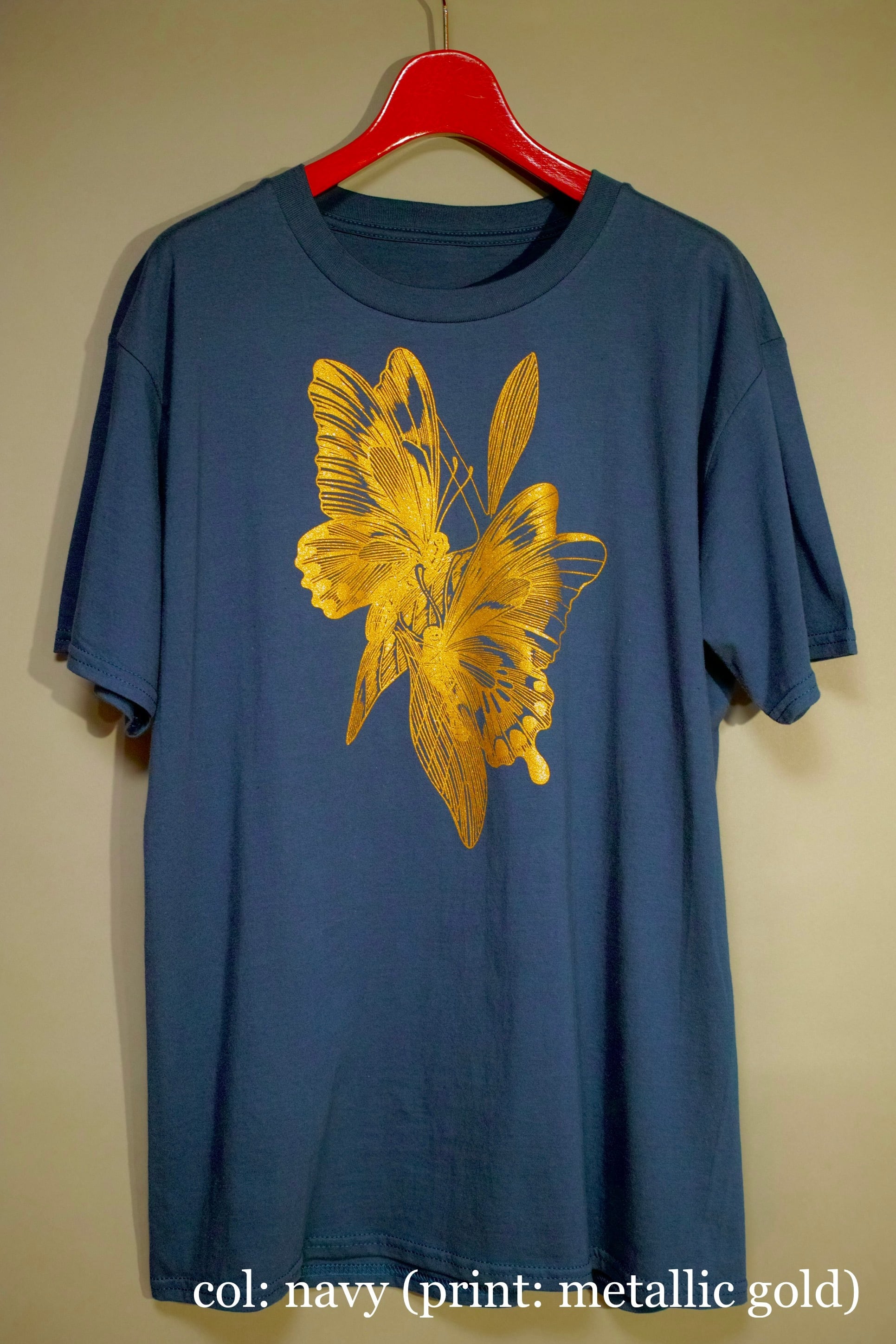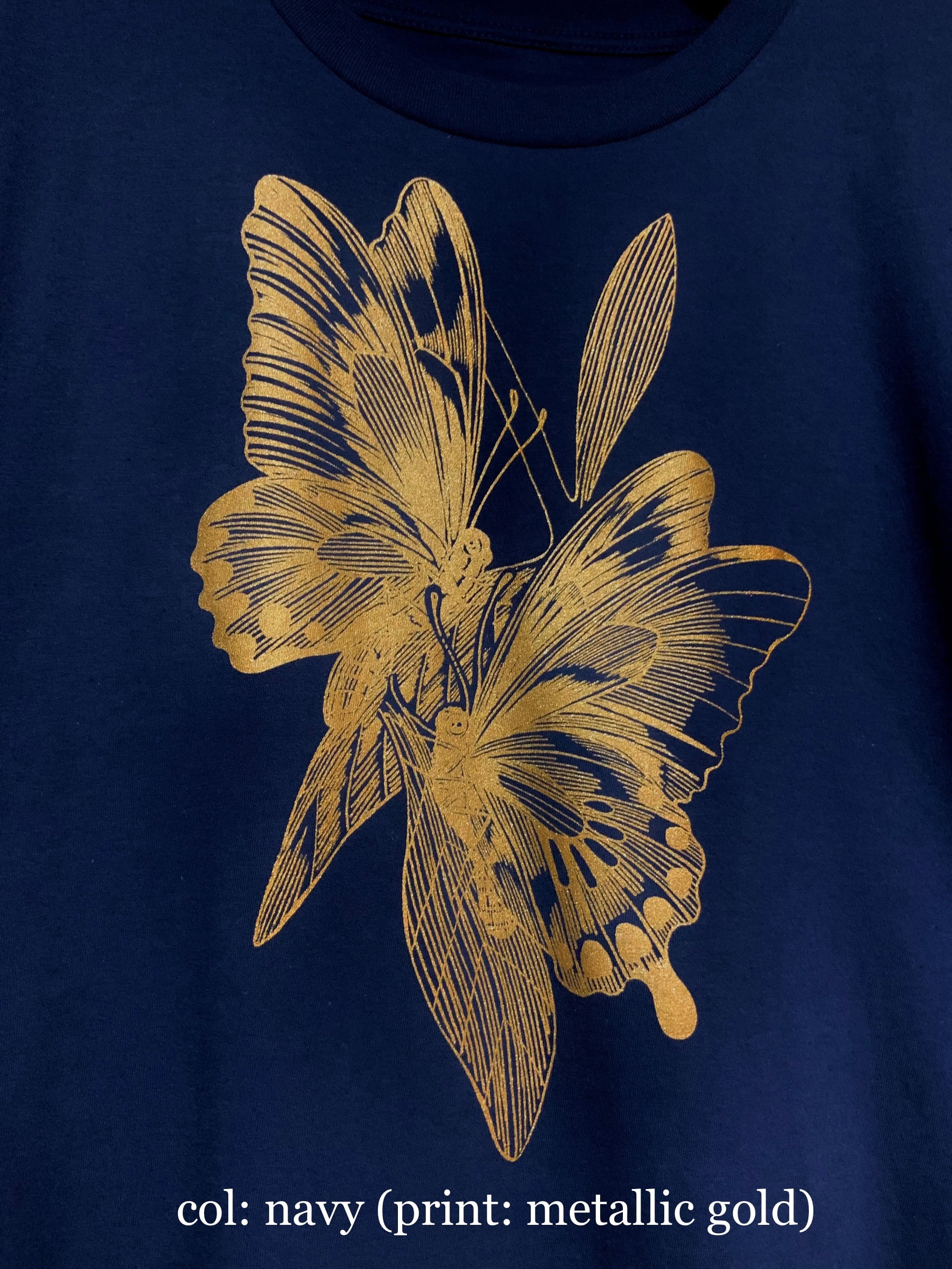 メタリックゴールドラインで描かれた蝶柄のTシャツです。