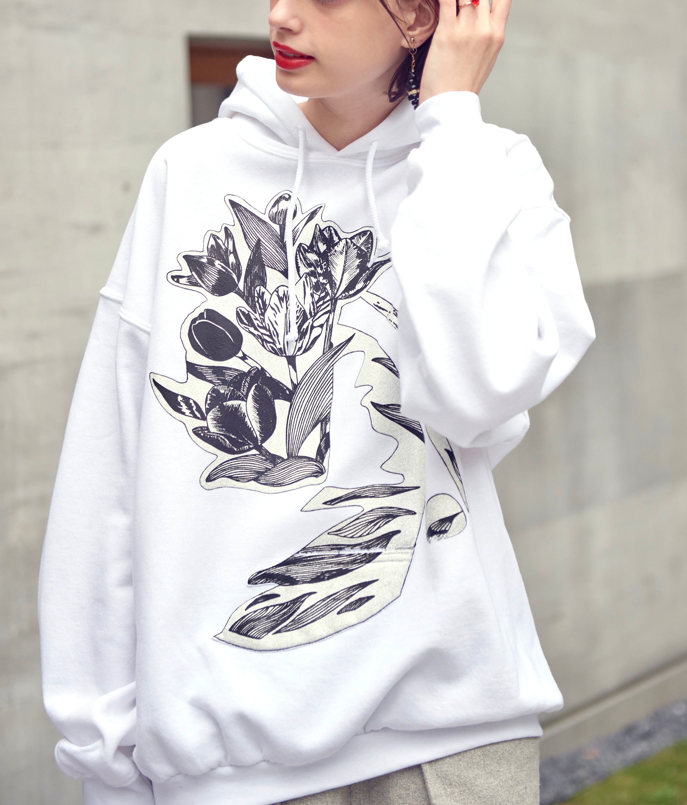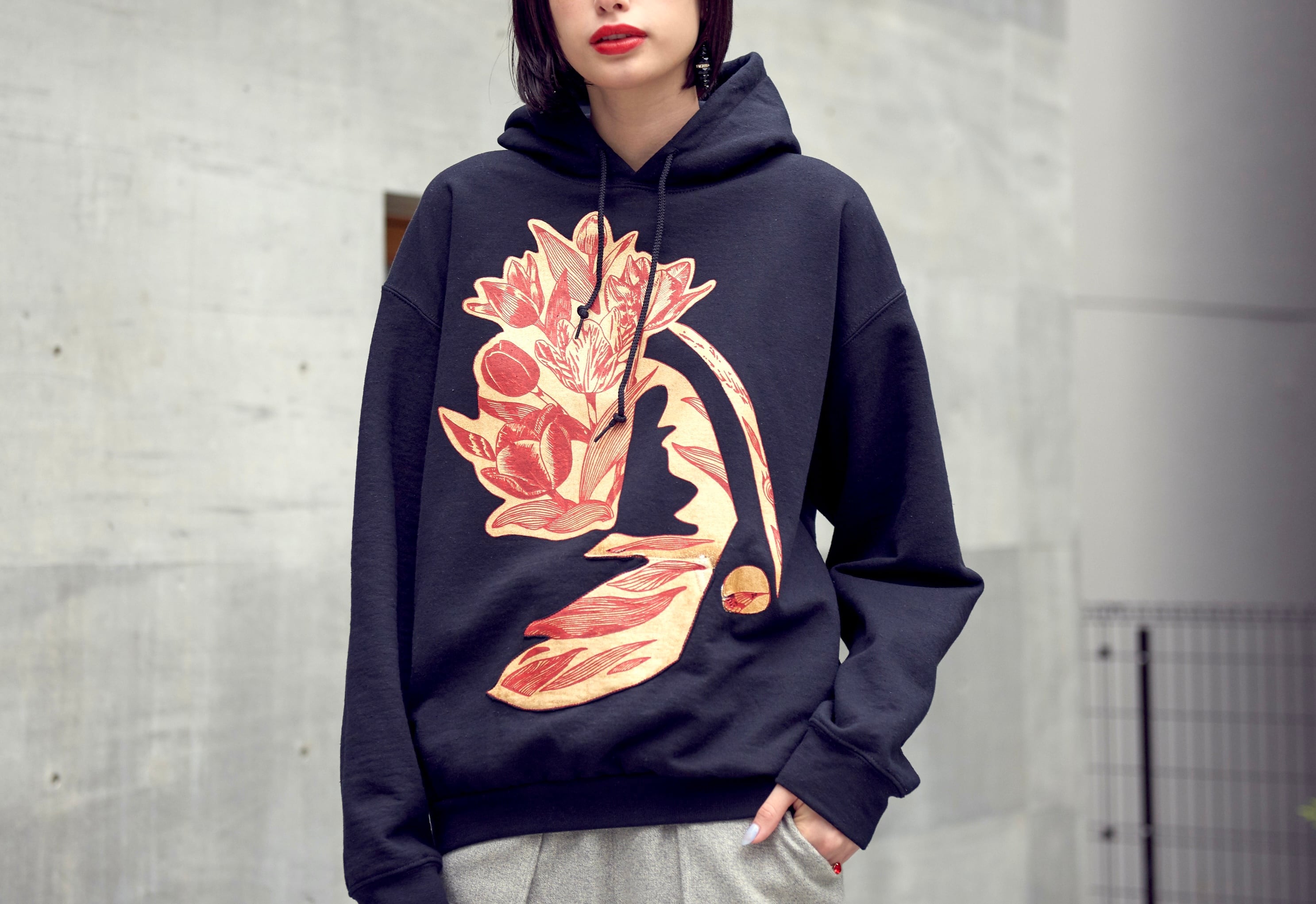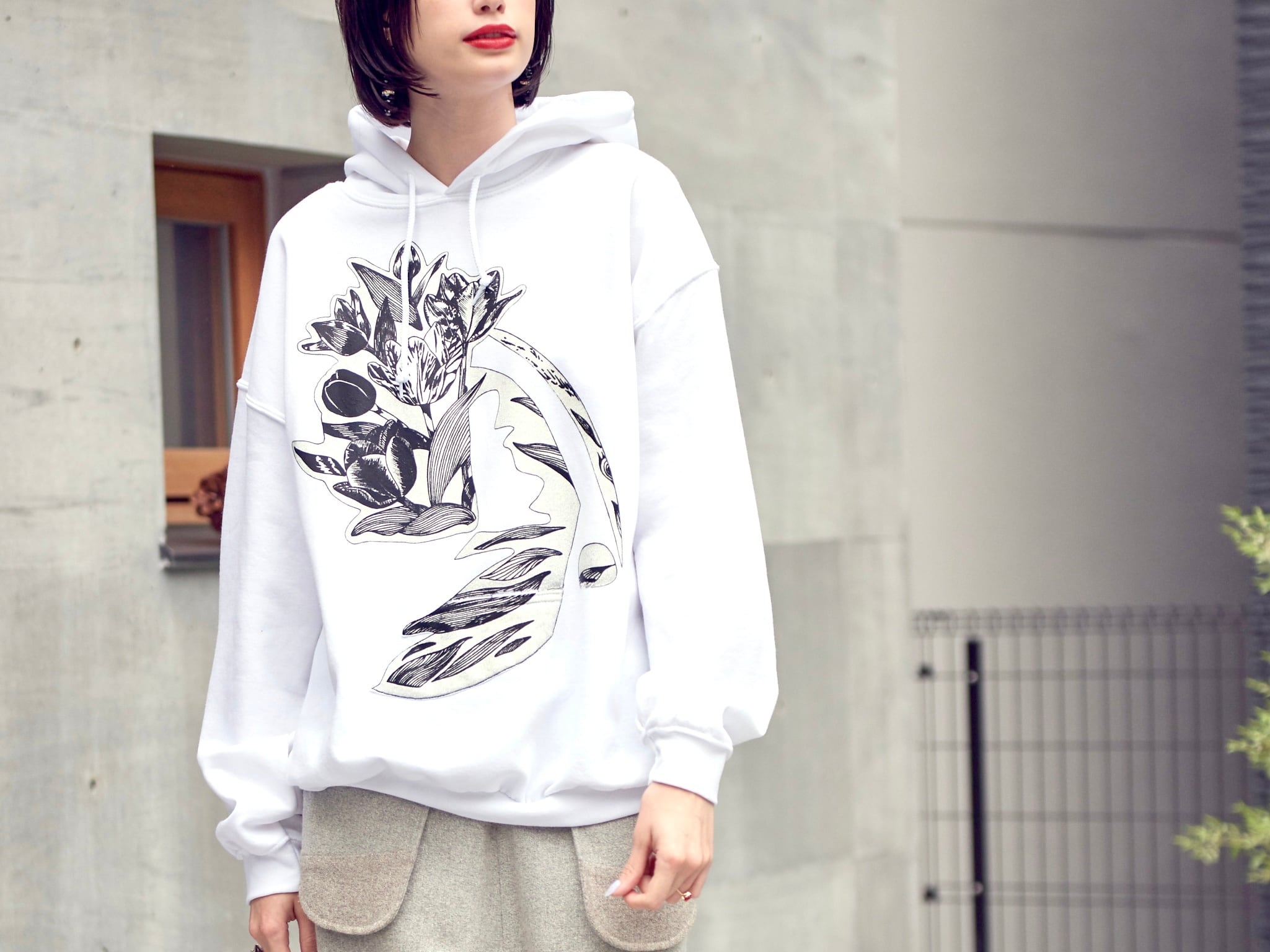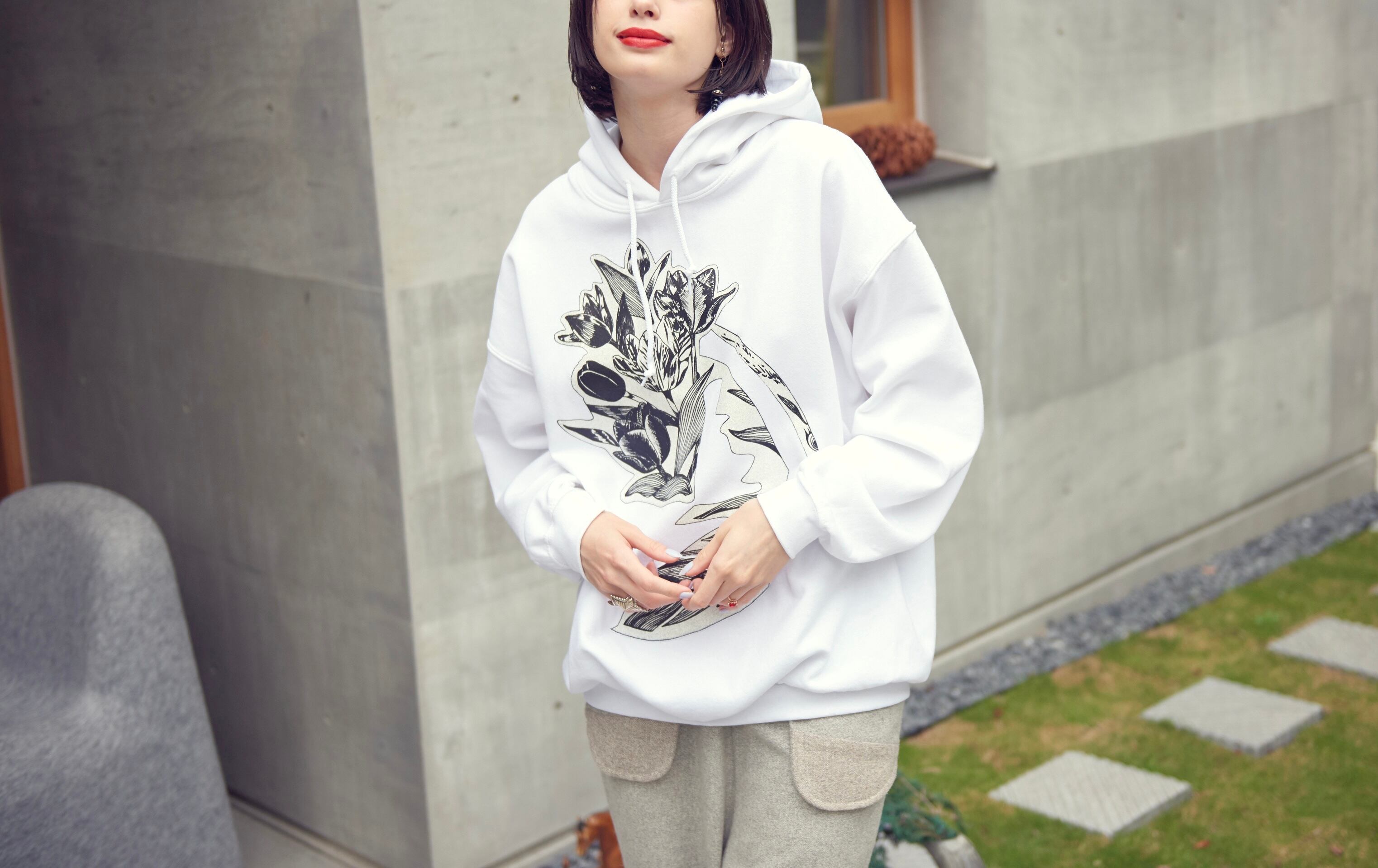 リラックスした雰囲気を持つフーディーに、パーティーシーズンをイメージしたロブスターと早春を彩るチューリップ。
