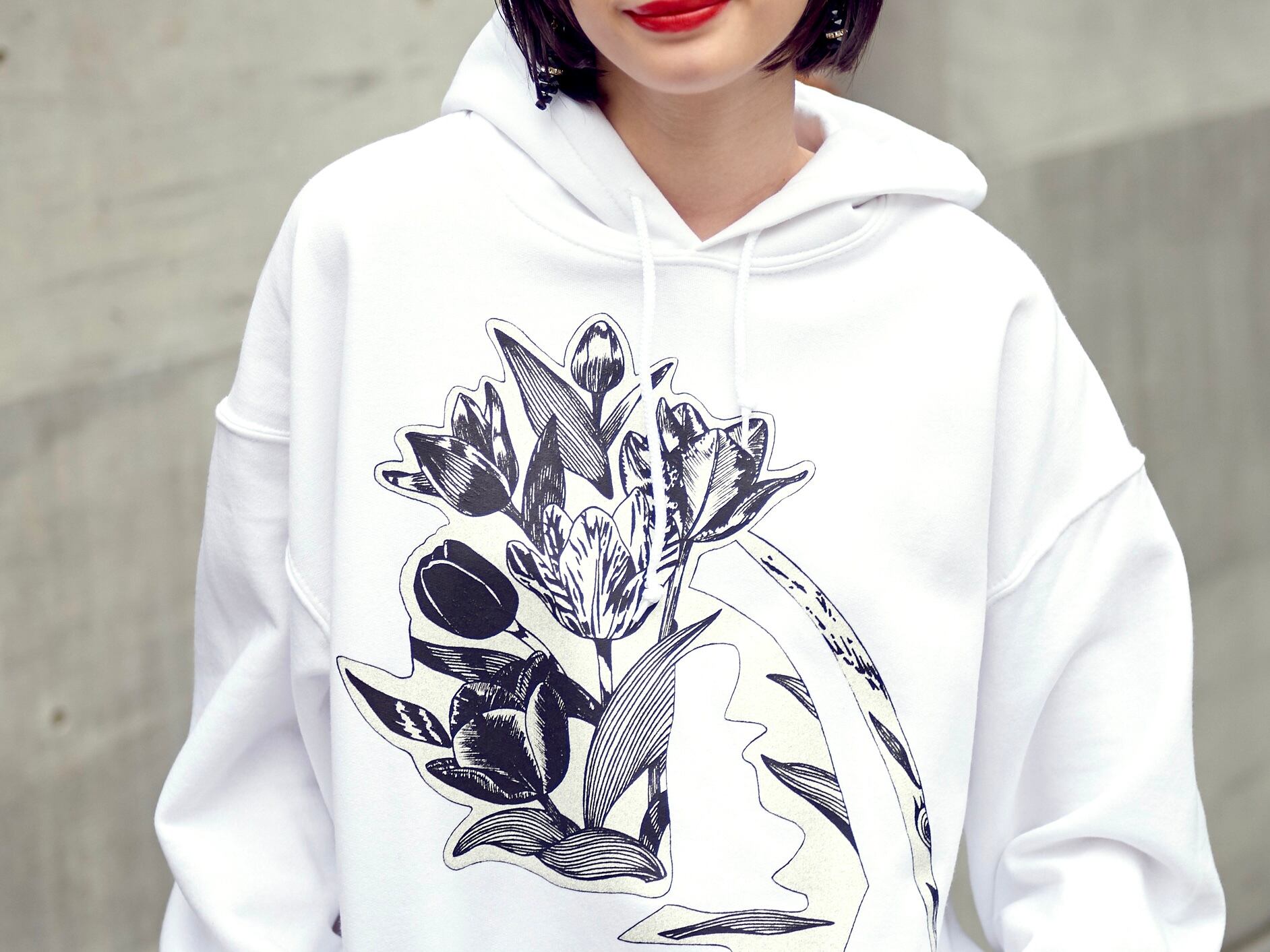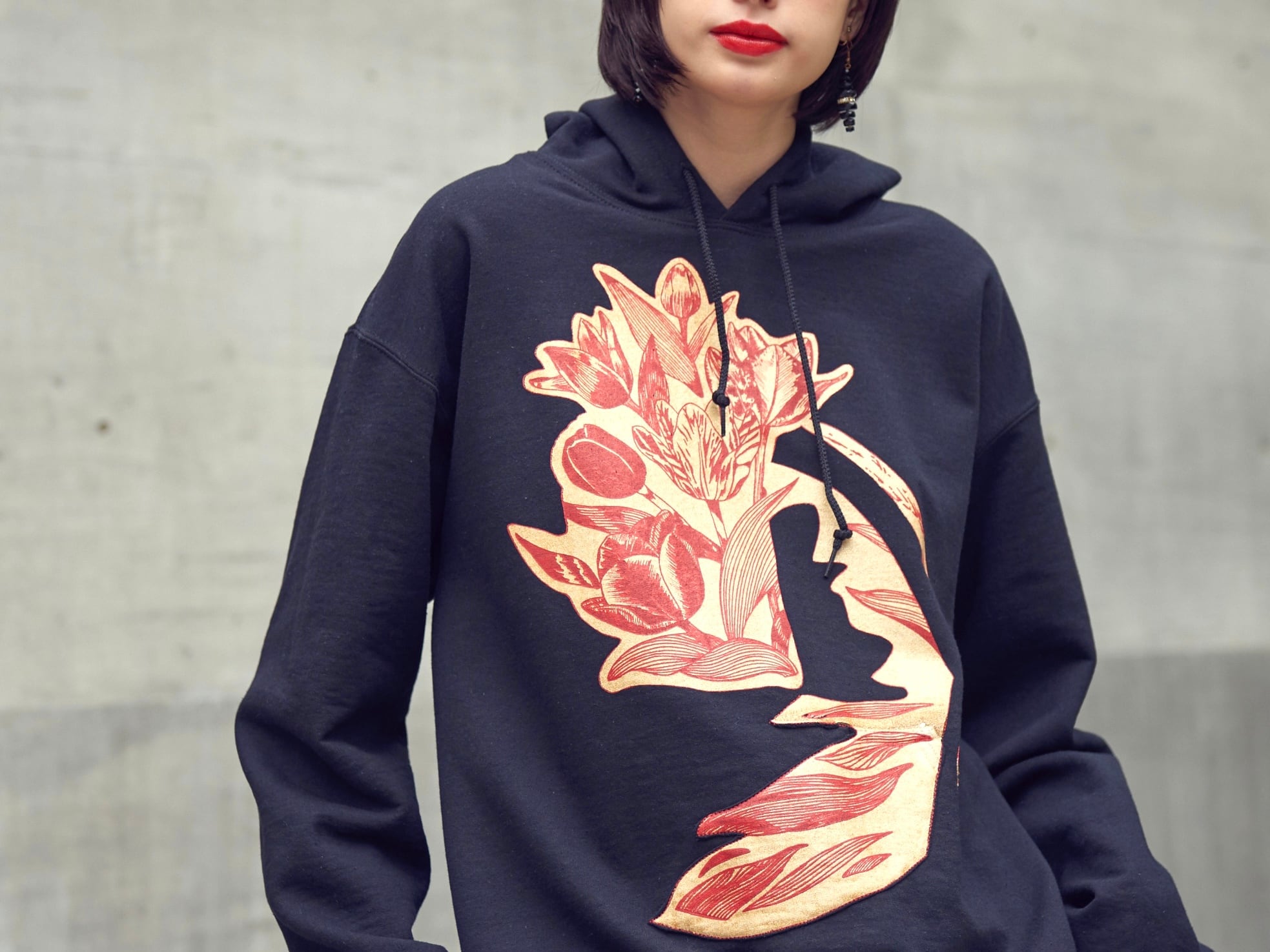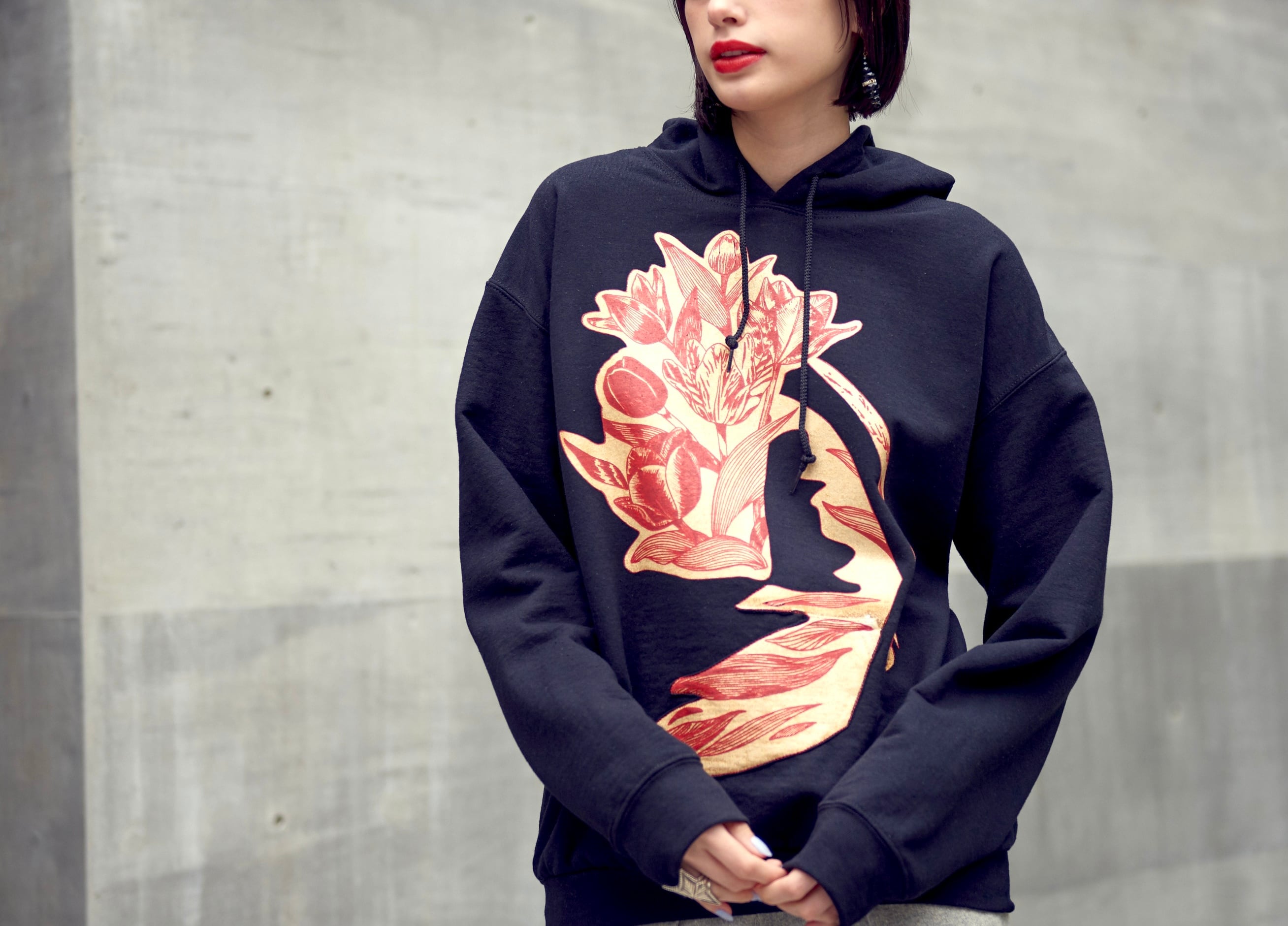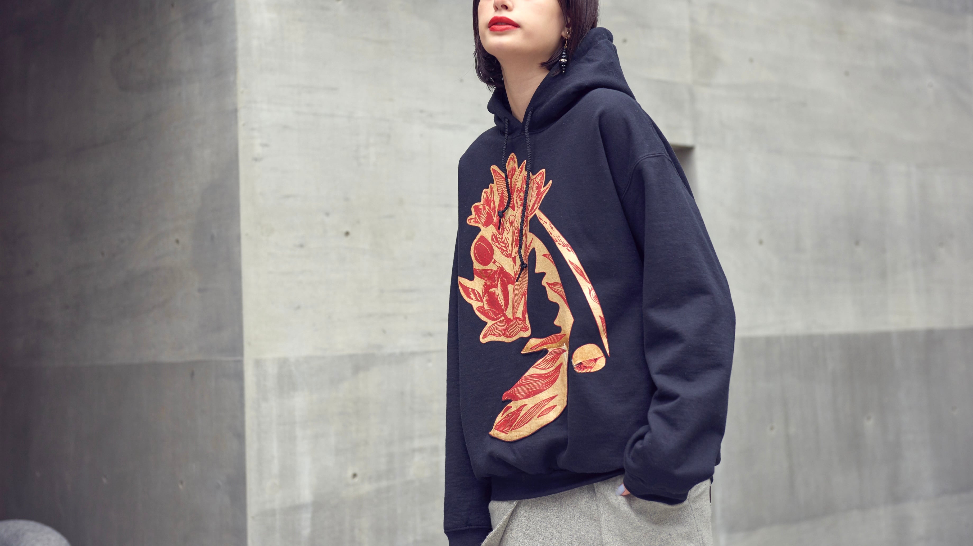 リラックスした雰囲気を持つフーディーに、パーティーシーズンをイメージしたロブスターと早春を彩るチューリップ。