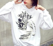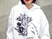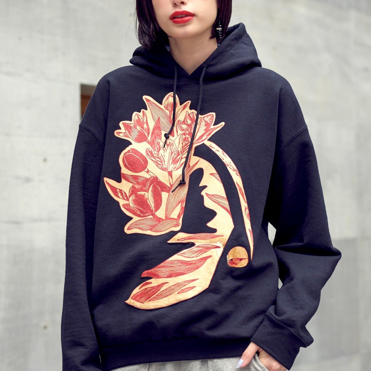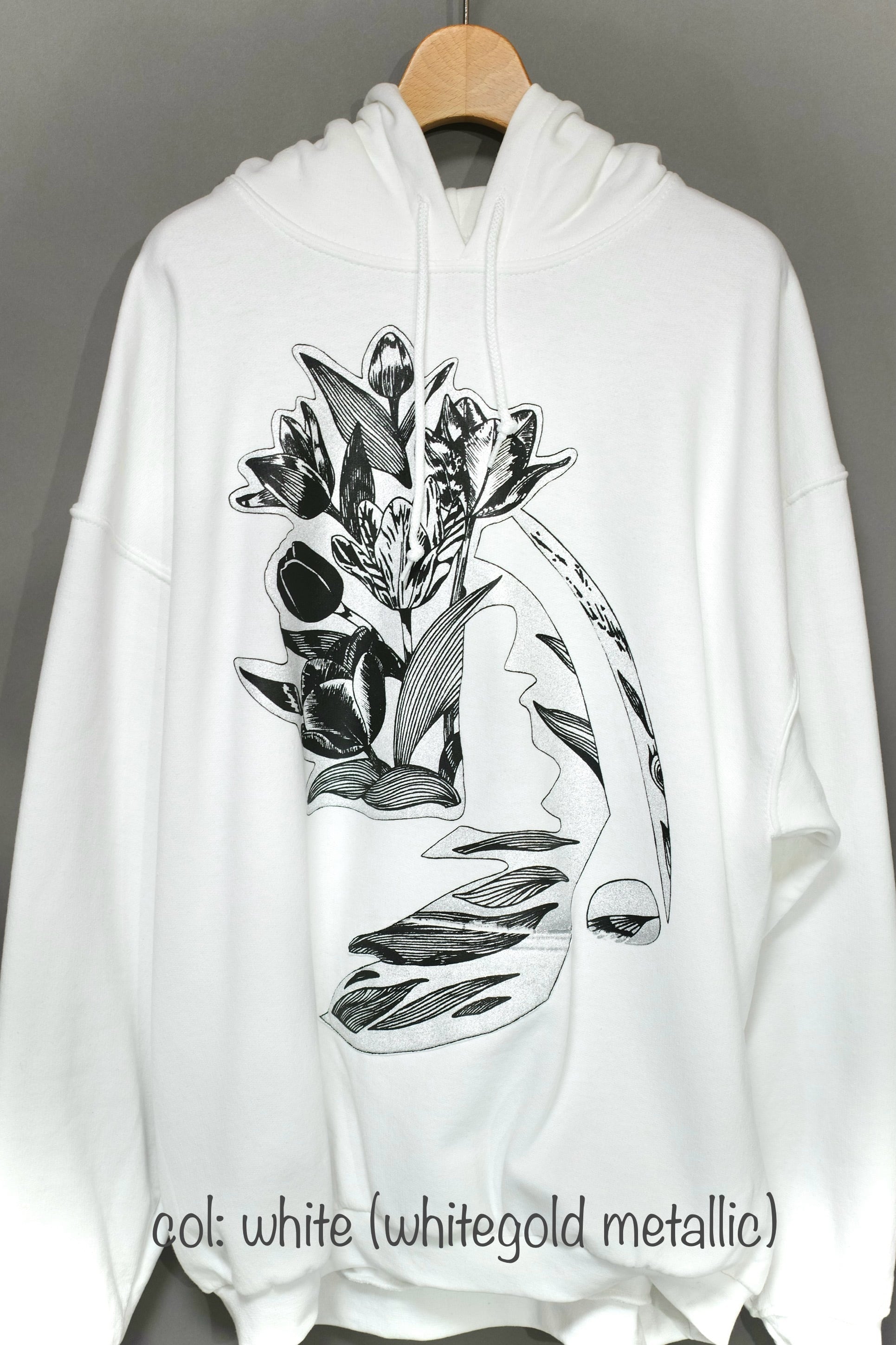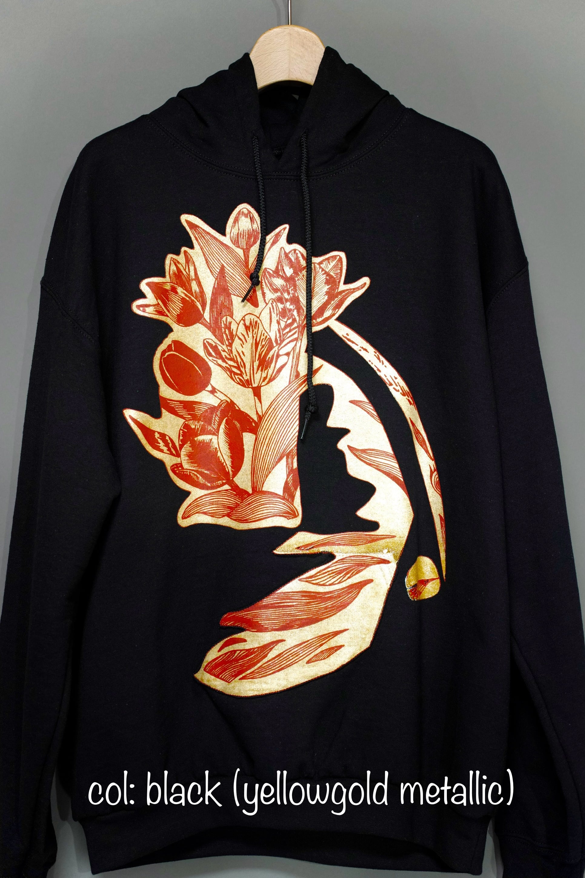 チューリップとロブスターをアーティスティックに描いた、メタリックプリントのフーディーです。